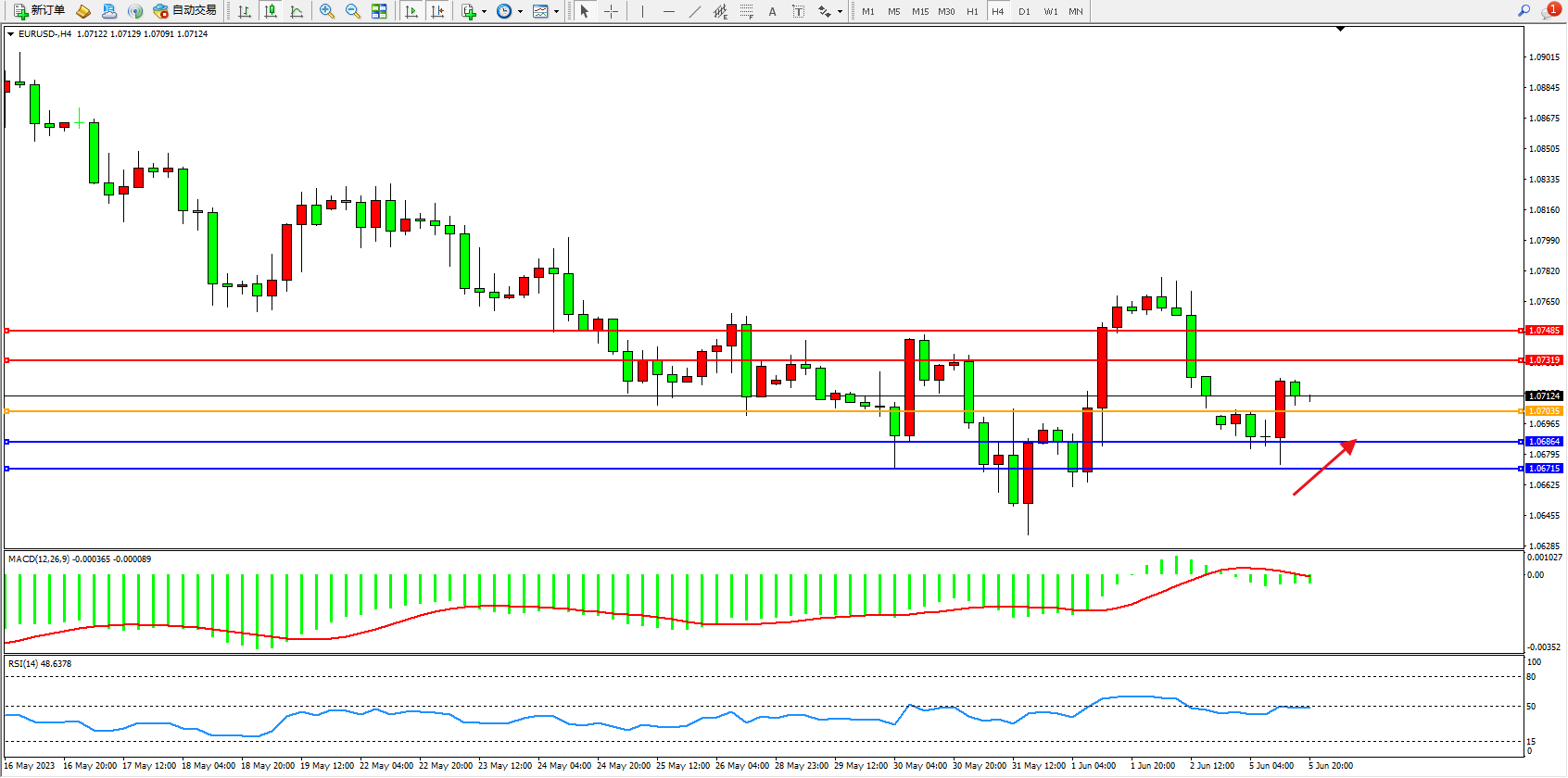 4小时图看:低位短期震荡,市场整体有多头动力上移迹象,MACD指标处于0轴线下侧弱势整理,RSI指标处于50均衡线附近弱势徘徊;