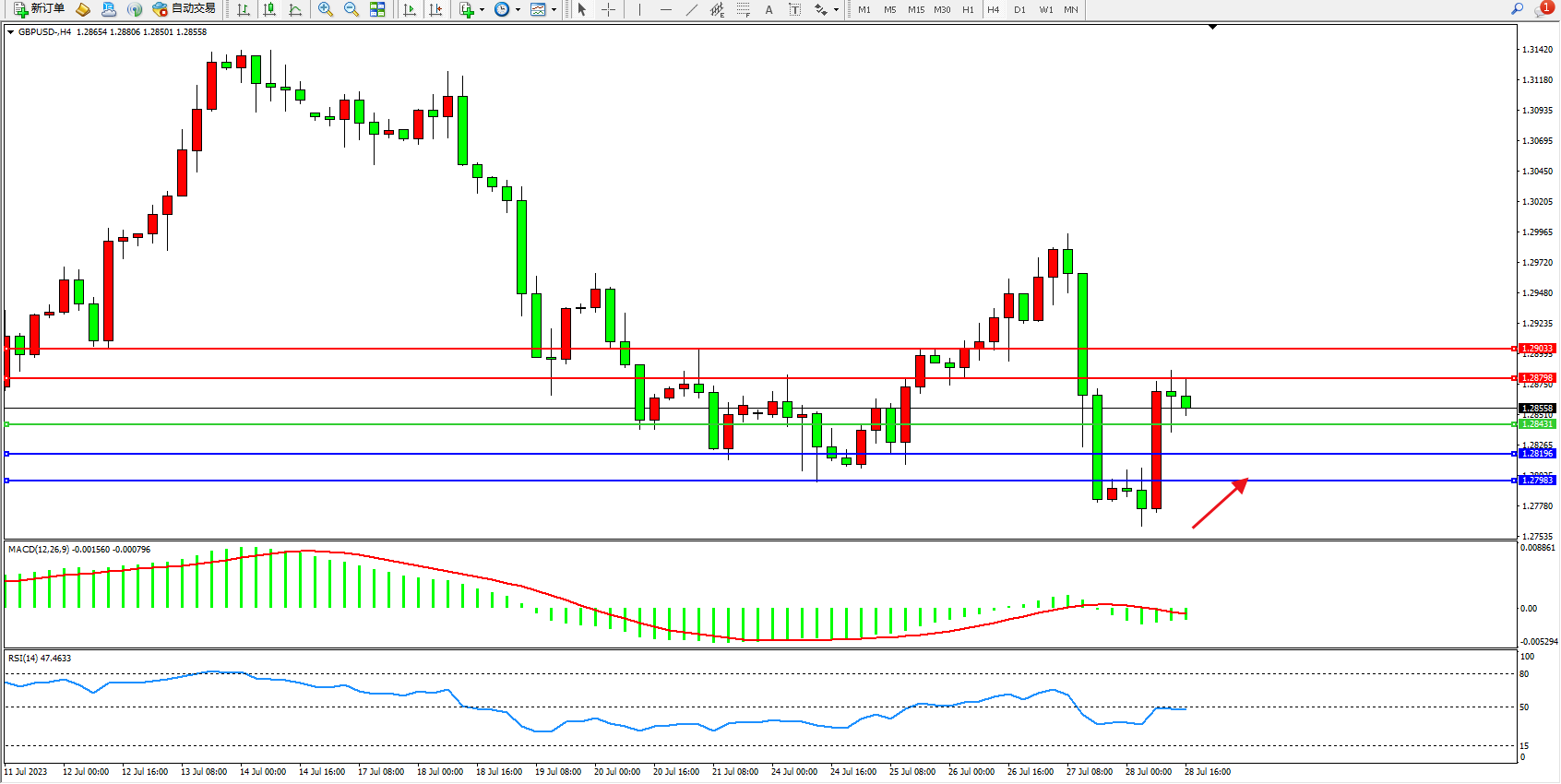交易策略:1.28431上方看涨,目标1.28798  1.29033