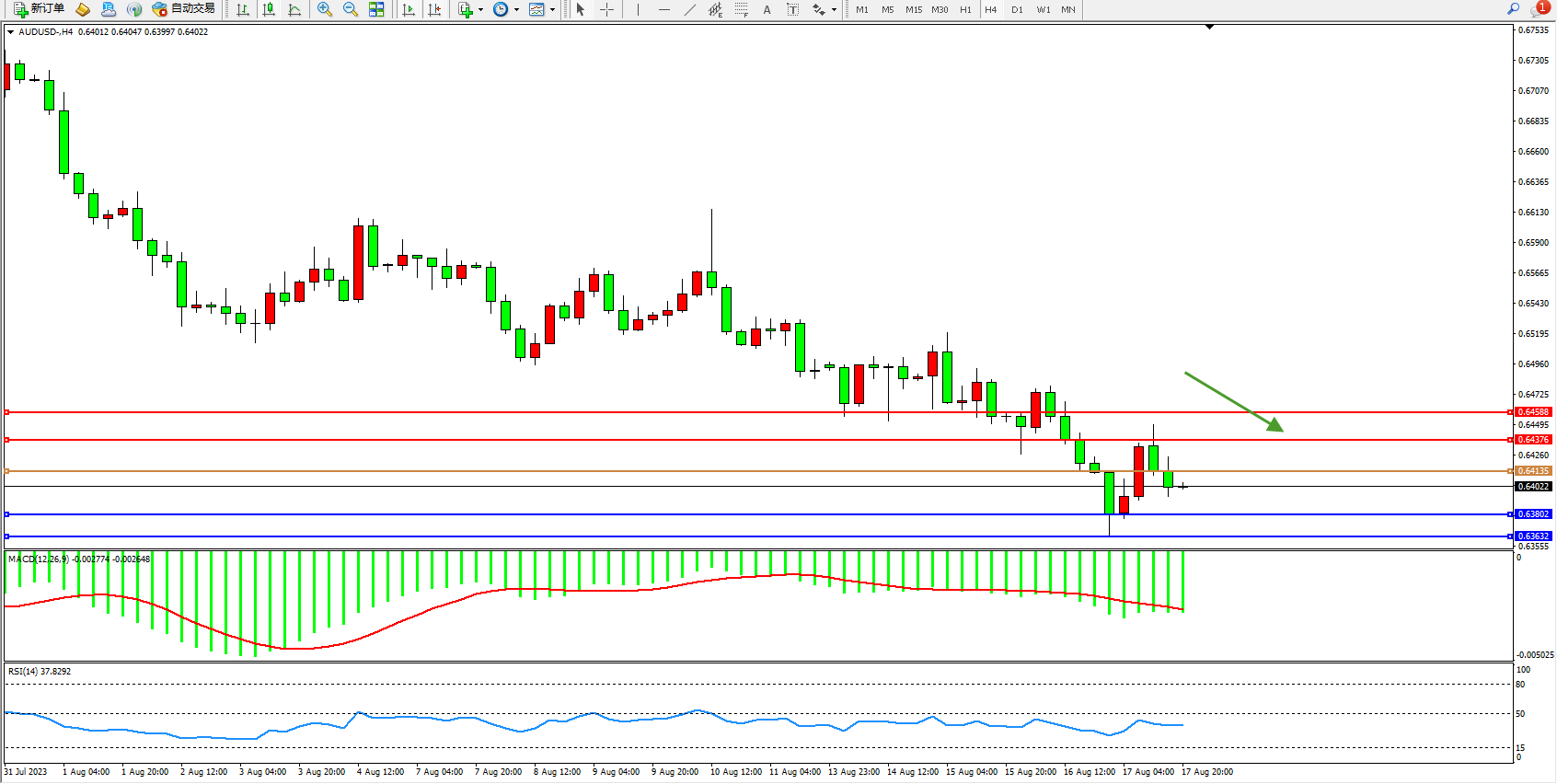 交易策略:0.64135下方看跌,目标0.63802 0.63632