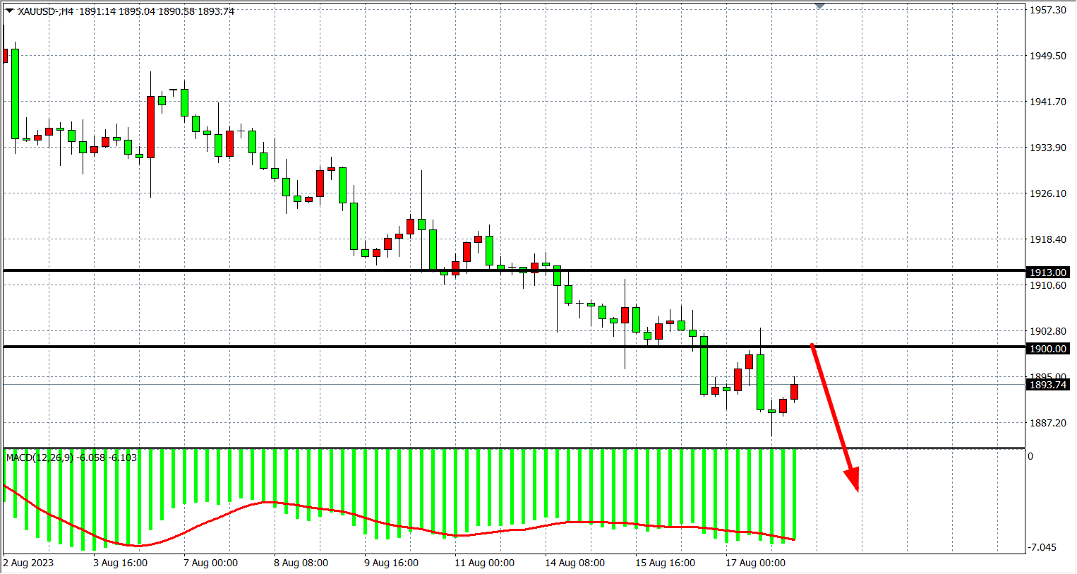 4小时图看,黄金维持在1900关口之下,MACD量能延续零轴下持续均匀放量,走势维持空头行情,阻力继续关注1900-1913附近,支撑关注下方1880-1860。