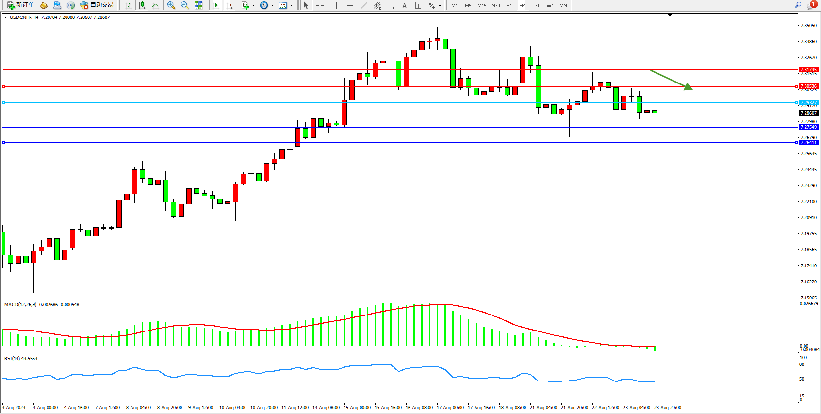 美元人民币USDCNH——4小时K线图显示: