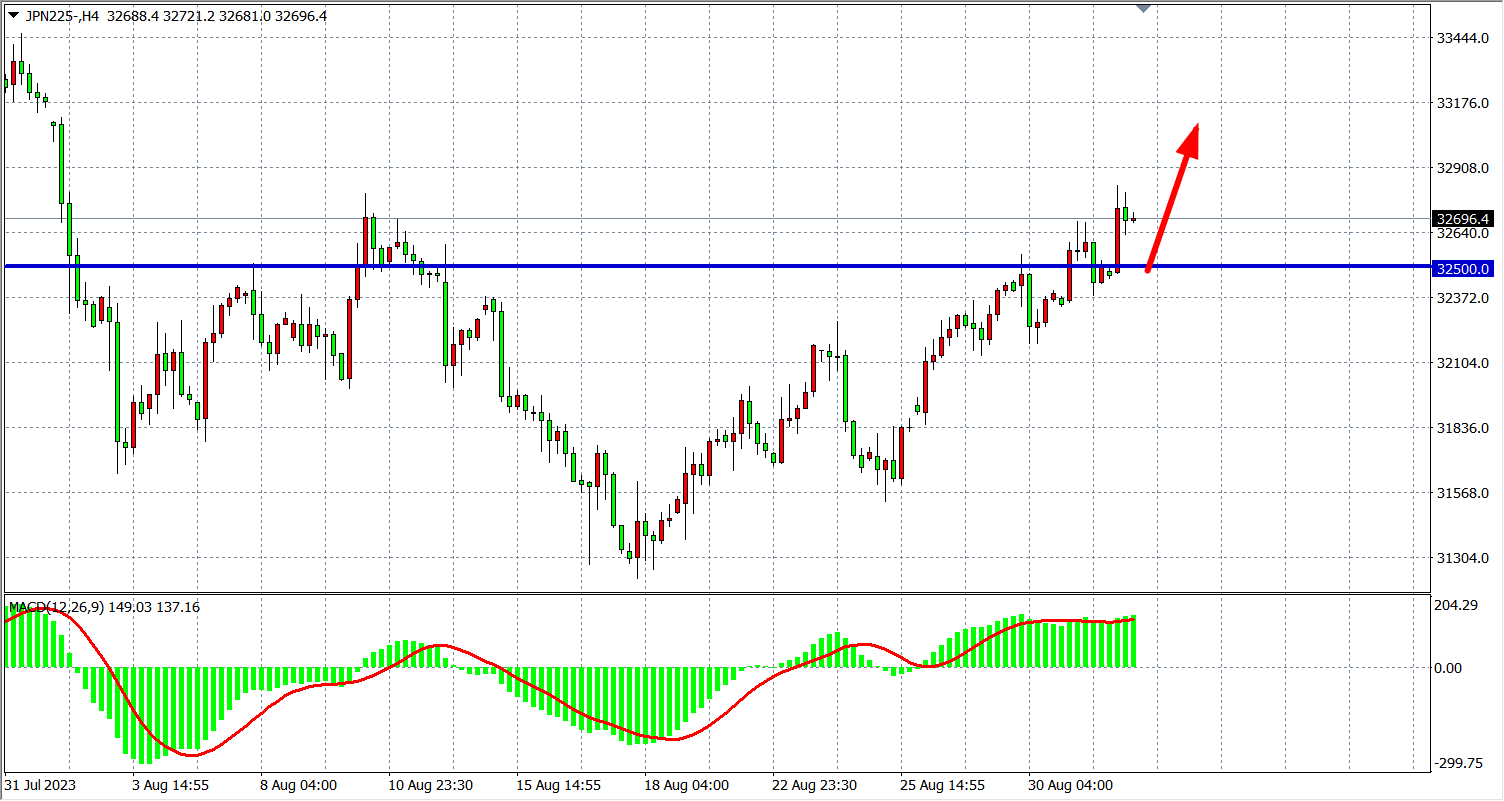 4小时图看,日经指数在32500之上继续走高,MACD量能在零轴上维持均匀,支撑关注32500附近,阻力上看附近。