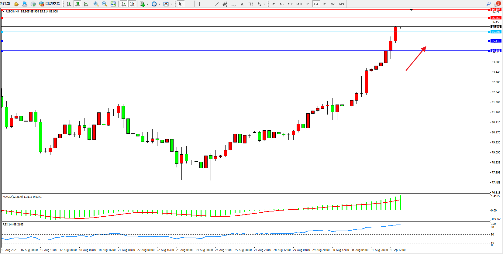 原油USOil——4小时K线图显示: