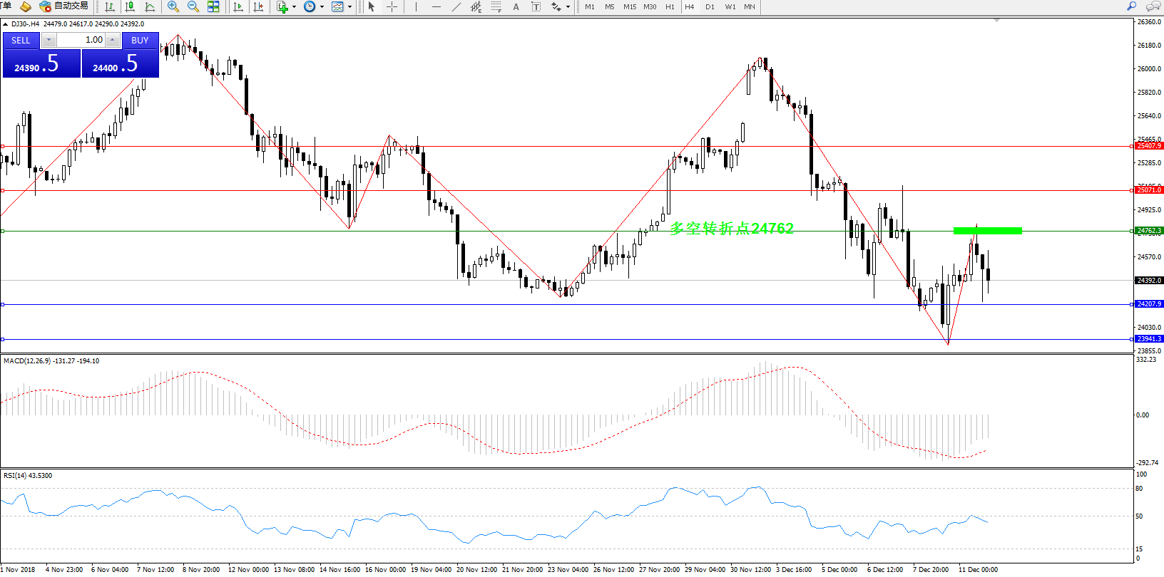 道琼斯指数DJ30——4小时K线图显示: