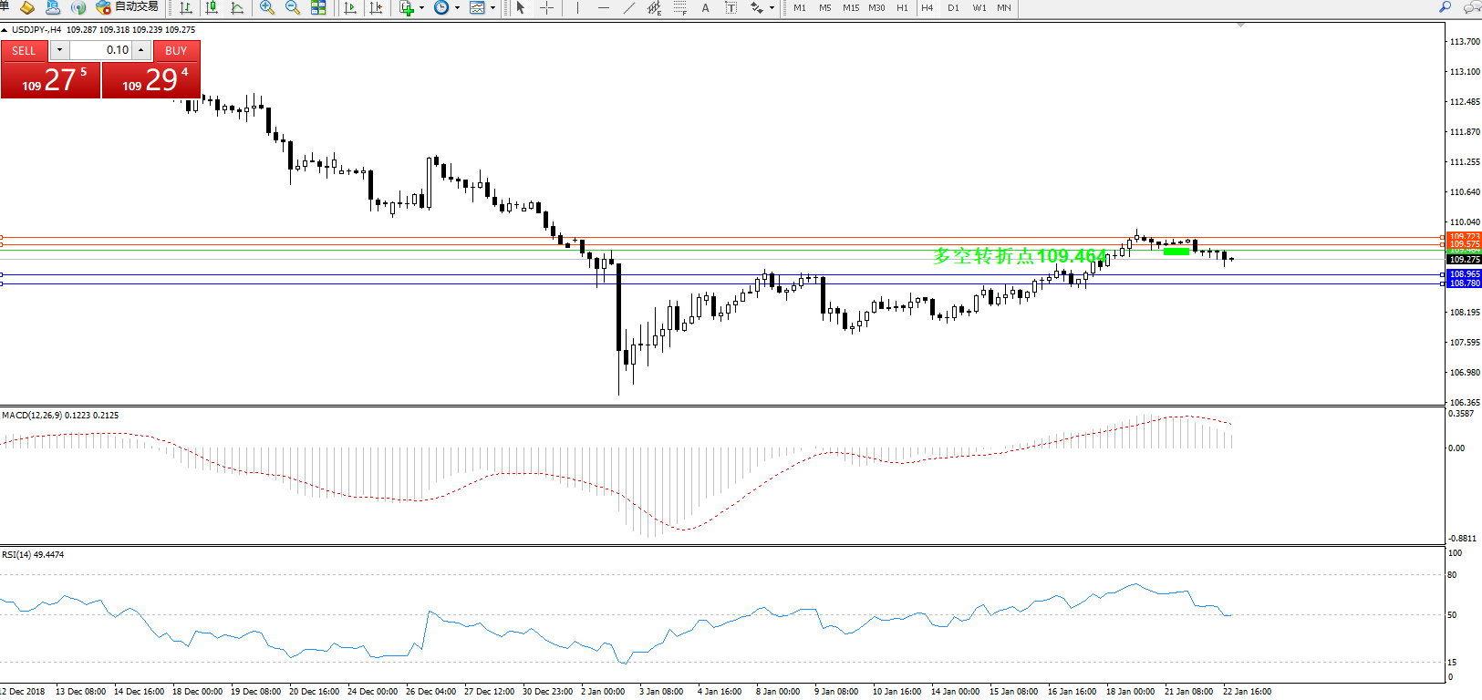 交易策略:109.464下方看跌,目标108.965、108.780