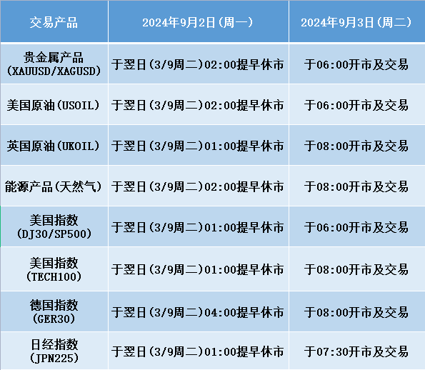 因应2024年9月2日(周一),为美国劳动节假期,本公司以下产品的交易时间将于假期期间作以下安排,敬请留意。