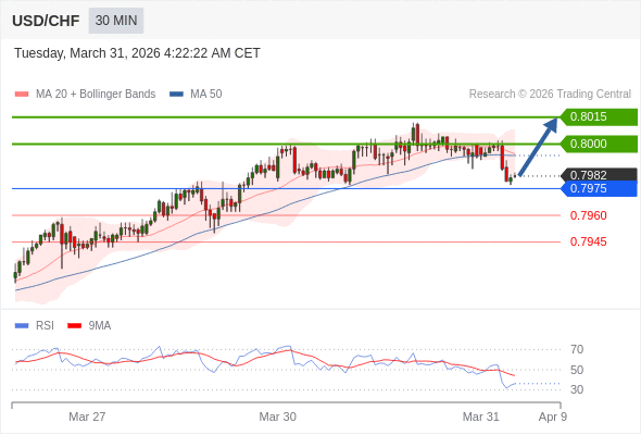 在 0.7975 之上,看涨,目标价位为 0.8000 ,然后为 0.8015 。