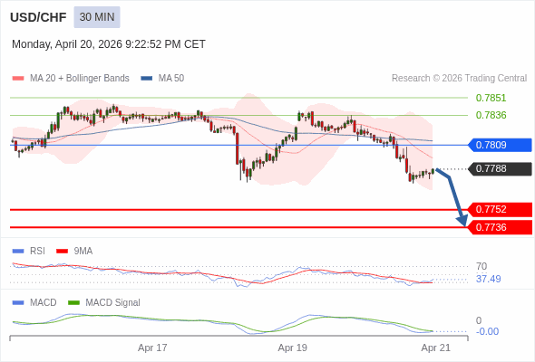 美元/瑞郎 当日内 : 看跌,在 0.7809 之下。