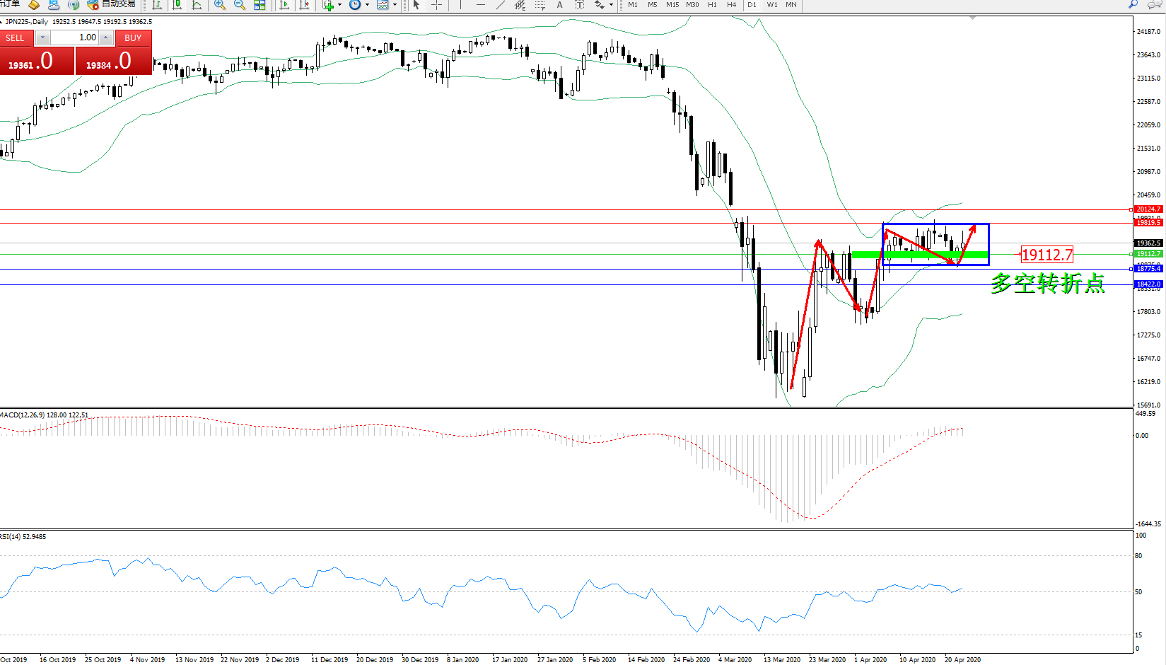 日经225指数4月23日(周四)收盘上涨274.05点,涨幅1.43%,报19412.00点。日本央行开始探讨采取增加公司债和商业票据购买额度的加码宽松措施,以支援企业因新型冠状病毒疫情扩大而恶化的资金周转。此事将在27日的货币政策会议上展开讨论。一旦实施,将是央行继3月会议之后连续第二次加码量化宽松。央行当天宣布,原定27至28日举行的货币政策会议日程缩短为1天,从27日上午9点开始,大约在中午结束。日本政府称,日本经济“迅速恶化”,形势“极其严峻”,这是11年来最悲观的评估,下调对消费和产出、就业和企业收入的评估。