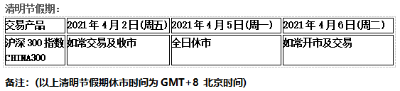 因应42(周五)欧美市场耶稣受难复活节假期及4月4日(周日)中国市场清明节假期,以下产品的交易将于假期期间休市,敬请知悉留意