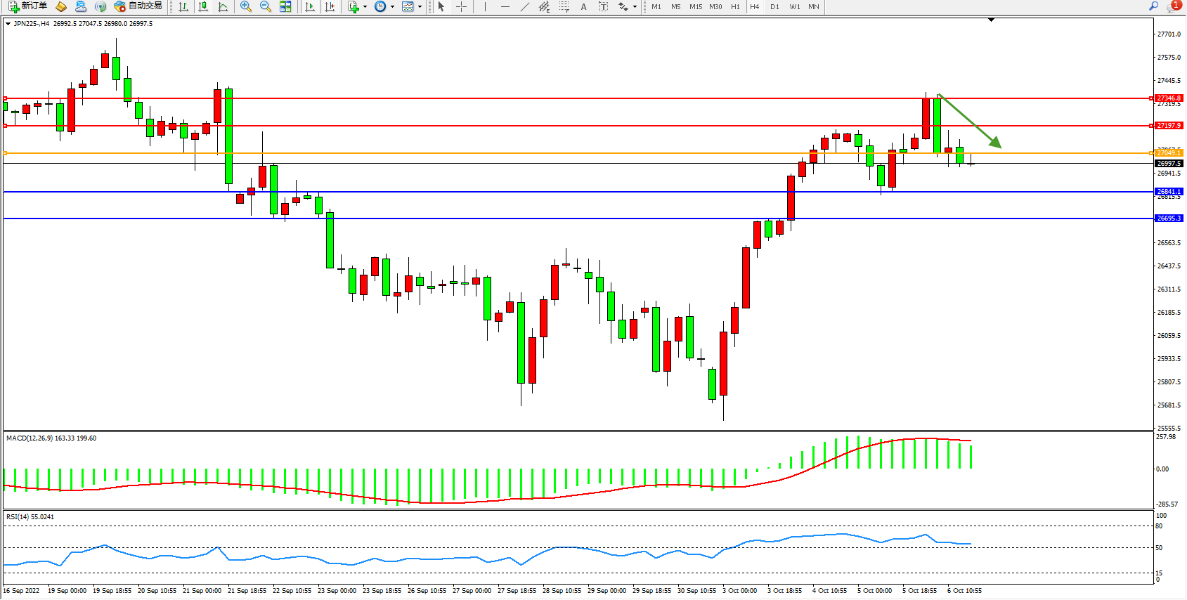 日经指数JPN225——4小时K线图显示: