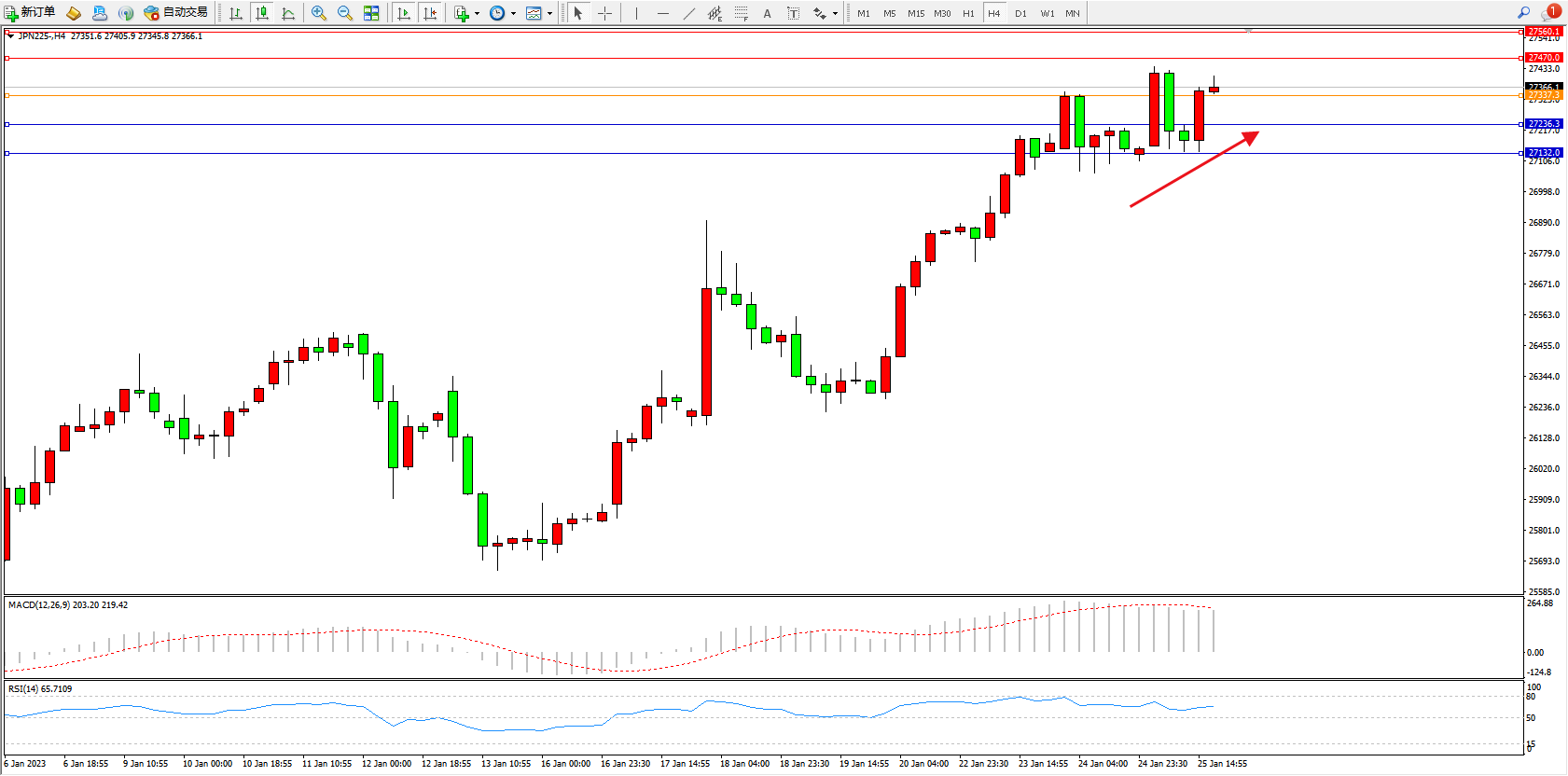日经指数JPN225——4小时K线图显示: