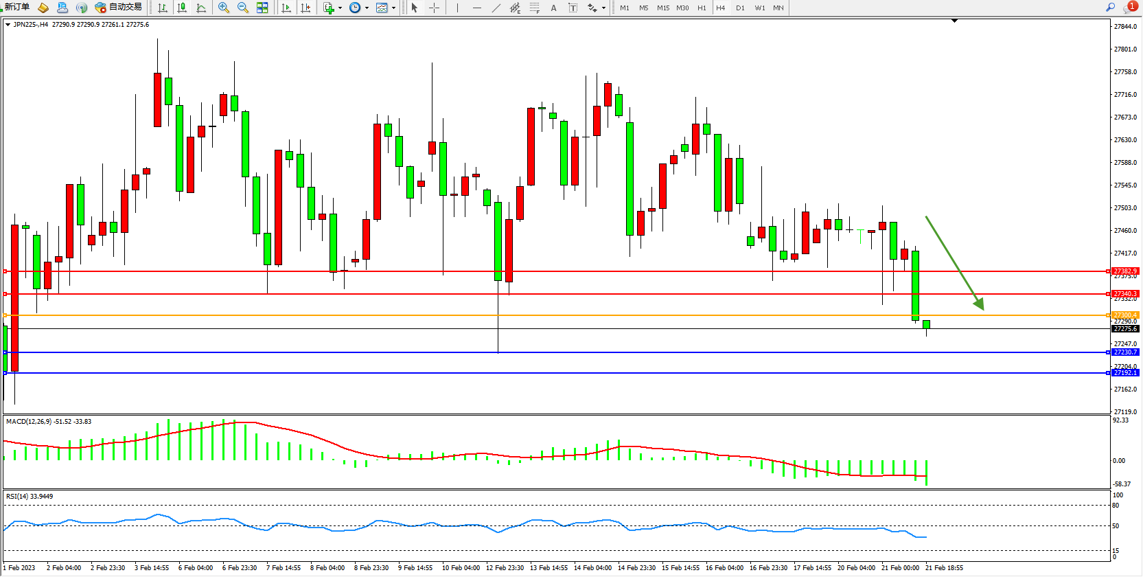 日经指数JPN225——4小时K线图显示: